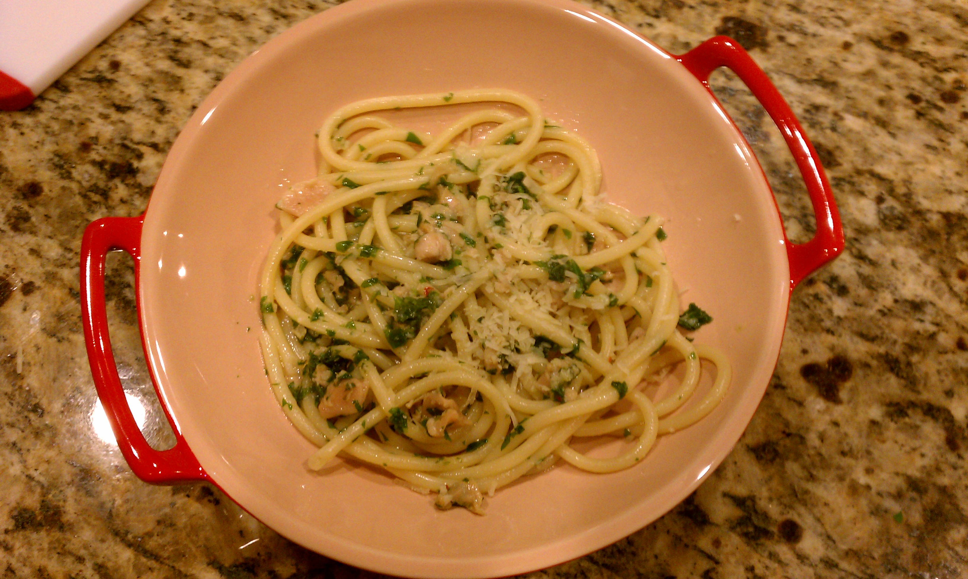 Would be bucatini — my new love. I have eaten this variety of pasta in Italian restaurants, but had not seen it in the grocery store until recently. It is part of the new-ish Giada De Laurentiis line at Target, and it is fantastic. It’s like a very thick spaghetti with a hole running through the middle, so you can imagine the delight of my children when they discovered how much of a mess they could create while eating this food. I used this bucatini when trying out my second recipe of 2012 — Allison Fishman’s Linguine Vongole from her book, “You Can Trust a Skinny Cook”. It is a simple and wonderful clam sauce over pasta. You simply cannot go wrong with garlic, olive oil, and white wine. Period.
