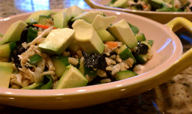 To 1/2 cup of plain Greek yogurt, add 1/2 cup diced cucumber, 1/2 cup diced tomatoes, 1/4 chopped avocado, and salt & pepper. That’s it. It tastes amazing and is a nice change from my normal sugary yogurt snack.