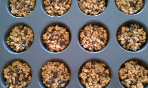 These muffins turned out beautifully — filled with pumpkin, carrot, chocolate chips, and LOTS of pumpkin pie spice.  The house smells fantastic.  This recipe uses maple syrup instead of sugar for sweetness, which goes so well with the pumpkin.  I substituted 1/4 cup of wheat germ for 1/4 cup of the flour to bump up the health factor even more.  I also put walnuts on top of half the muffins instead of mixing them in, to ensure harmony in the household come breakfast-time.