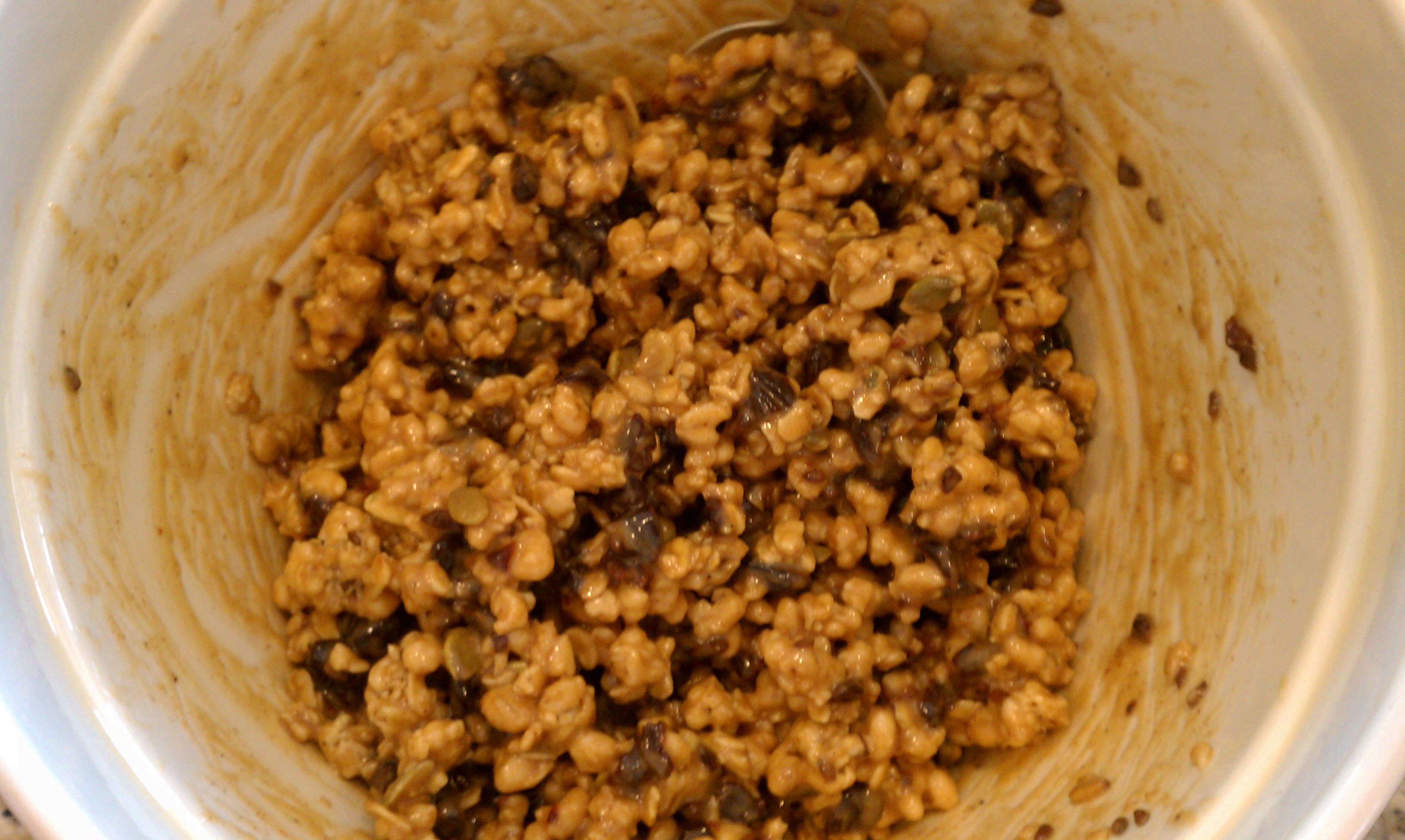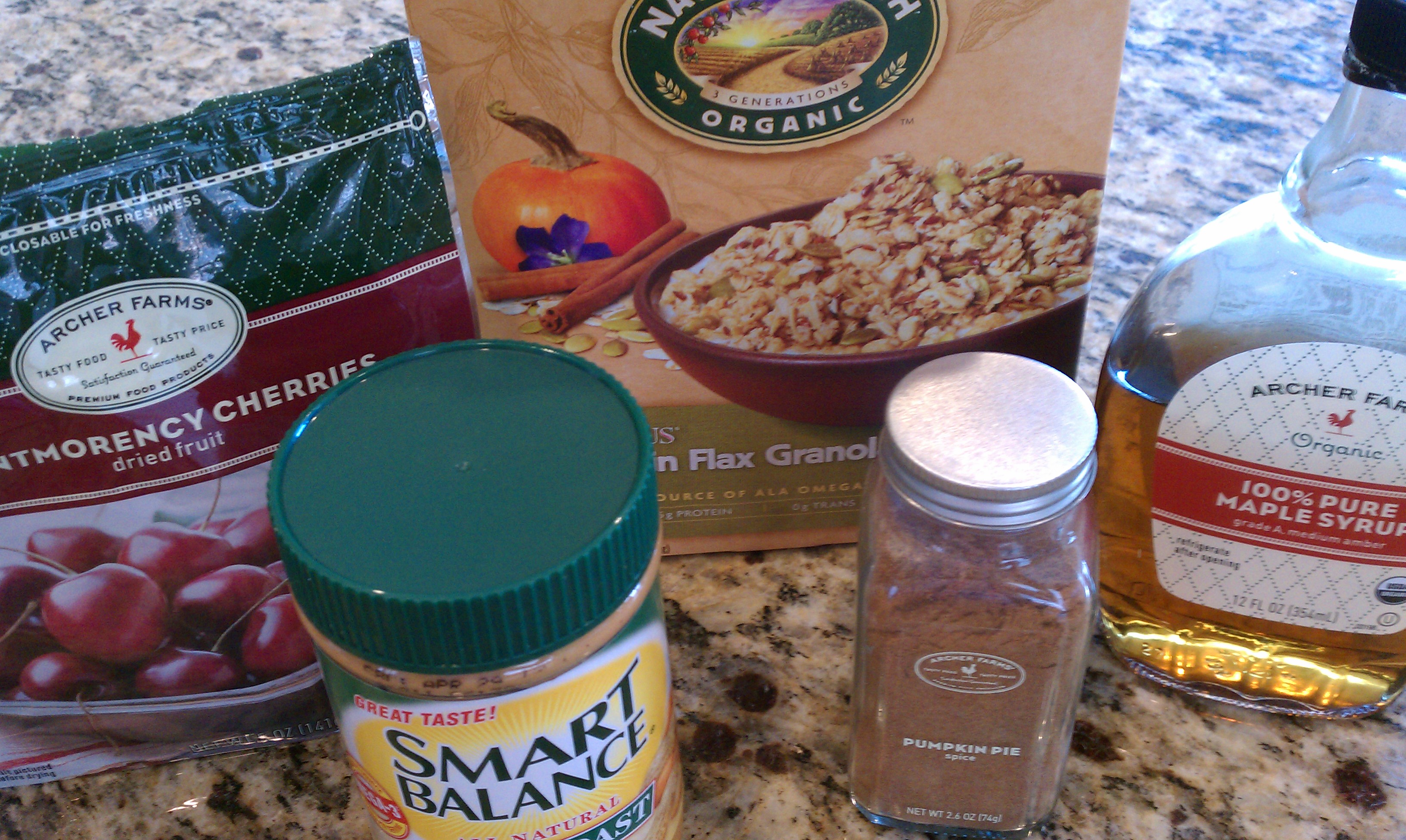 First up is a Looneyspoons Collection recipe called Goody Two Chews.  They are sweet, chewy, and have a big hit of pumpkin pie spice (if you don’t love pumpkin pie spice, cut it back or swap for cinnamon).  I found a video of Greta Podleski demonstrating the recipe, and I have included my version of the recipe below.  The original recipe calls for light peanut butter (I used regular) and dried cranberries (I used dried cherries); you can certainly swap in your own favorites.  For the low-fat granola, definitely try to use Nature’s Path Pumpkin Flax Plus Granola.  It has pumpkin seeds but no dried fruit, so perfect for this recipe.  And, well, it’s delicious.