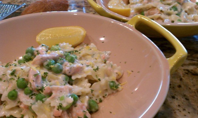My kids (like many kids I know) are happiest when the components of their meals are all separate from one another — protein, grains, fruit/vegetables are mixed together at your own risk.  I prefer the exact opposite:  easy one-pot meals that incorporate everything into one dish.  I’m especially happy when the recipe calls for lots of vegetables, herbs, and spices (a nightmare to my children).  This kind of cooking makes for easy leftovers too.  Every now and then I will see a recipe that incorporates everything in one dish but features ingredients the kids actually like to eat, and this Creamy Farfalle with Salmon and Peas from Self Magazine fit the bill.  Well, I take that back — they would happily pass on the peas, but you can’t get everything you wish for.